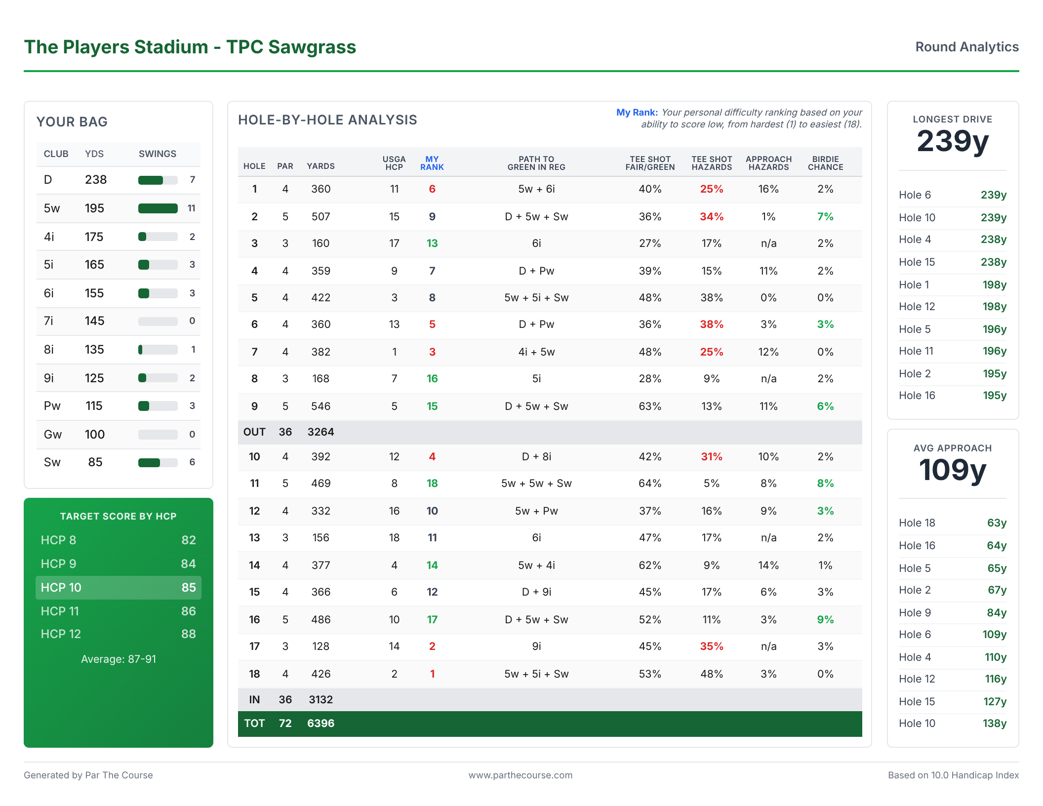 Each guide is a complete hole-by-hole strategy document personalized to your game.